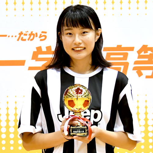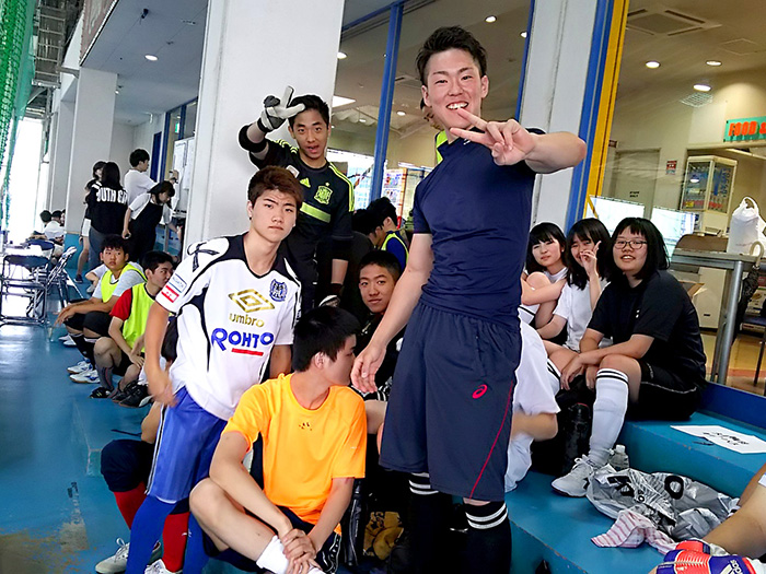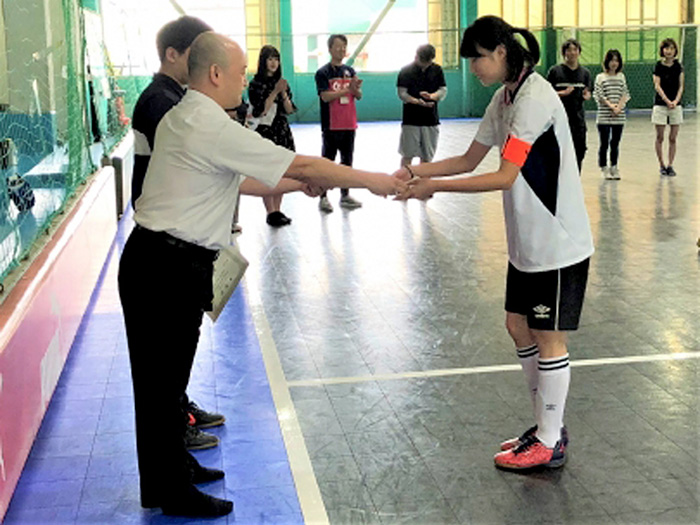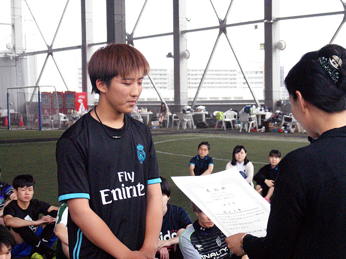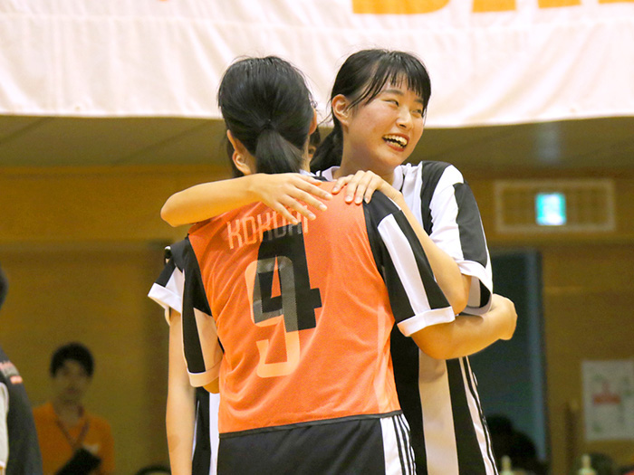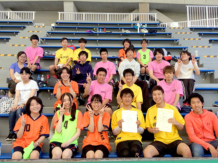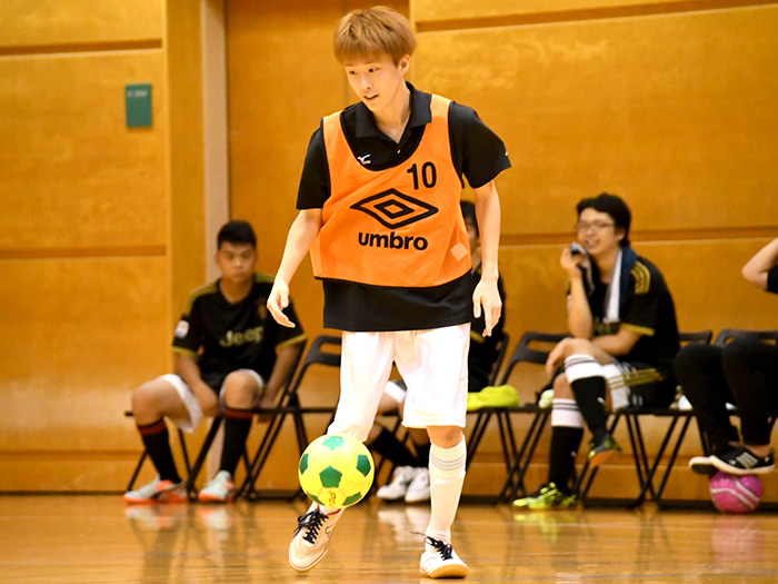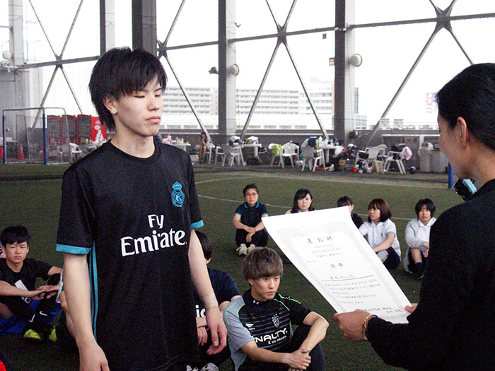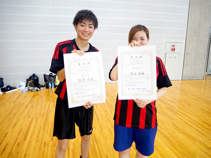 MVPをいただいてとてもうれしいです!決勝大会前は緊張で眠れないくらいだったんですけど、試合前にはチームのみんなと話しながら緊張をほぐしました。ディフェンスが大事だと考えていたので戦術を話し合ったりとか、負けても勝ってもしっかり笑って終われるように、とか。3キャンパスの合同チームだったので練習は神戸に集まって、家に帰ってから自主練もしました。他のスポーツでは野球の経験がありますが、フットサルは頭を使って体を動かしていくスポーツだと感じています。フットサルを通して自分も周りを見られるようになったかなと思います。