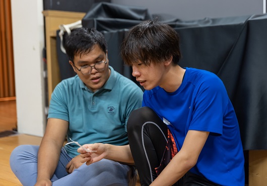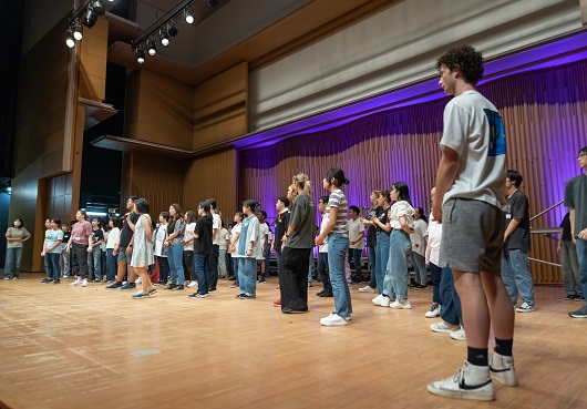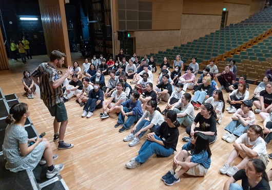舞台の上で一緒に取り組みます。次はどんな練習かな?