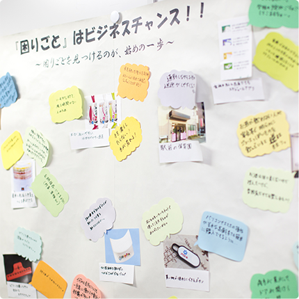 世の中にある商品や会社を例に、実際にビジネスが「困りごとの解消」から生まれていることを知り、駅の中で不便だと思うことを考えビジネスチャンスは世の中にたくさん隠れているということを発見できました。